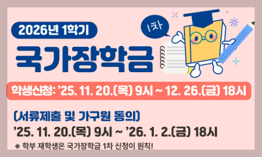 국가장학금 1차 신청은 매년 11월~12월 초 사이에 진행되며, 2026학년도 1학기 신청기간은 다음과 같습니다.