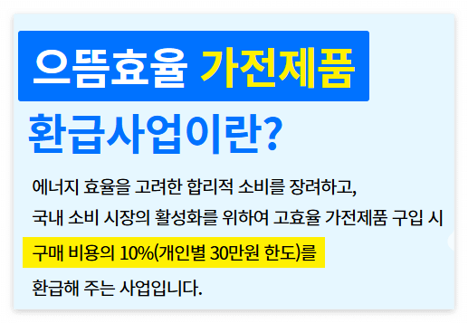 만 19세 이상 대한민국 국민이 TV, 냉장고, 세탁기 등 11개 품목의 최상위 효율 등급 가전제품을 구매할 경우, 구매비용의 10%(개인별 30만원 한도)를 환급해 드립니다.
