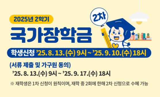 이번 2차 신청은 마지막 기회이니, 신청 기간과 소득분위 절차를 꼼꼼히 확인해 장학금 혜택을 놓치지 마시길 바랍니다.