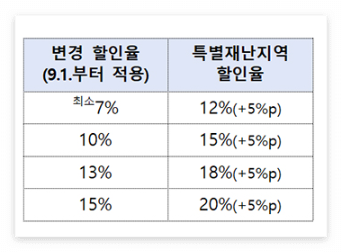 2025년 9월부터는 기존 5~10% 할인에서 크게 늘어나 7~15% 기본 할인율이 적용되며, 호우 피해로 지정된 특별재난지역은 20%까지 할인이 가능해졌으니 적극적으로 활용해 보시길 바랍니다.