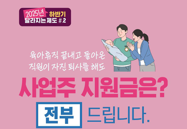 기존에는 육아휴직을 다녀온 근로자가 6개월 내 자진 퇴사할 경우 지원금이 절반만 지급되었지만, 이제는 전액 지급으로 바뀌어 기업의 부담이 크게 줄었습니다.