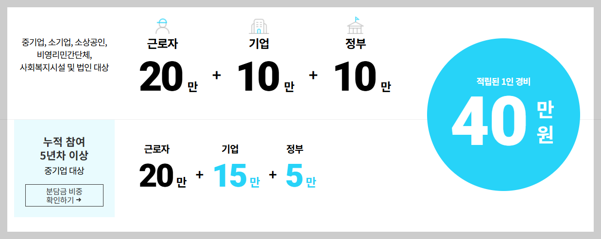 간단히 말하면, 근로자가 자비 20만 원을 부담하면 기업과 정부가 추가 지원을 얹어 총 40만 원을 마련해 주는 방식입니다.