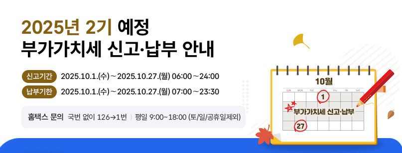 2025년 2기 부가세 예정신고 기간은 10월 1일~10월 27일입니다.